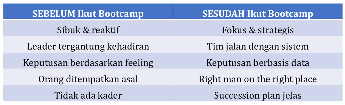- Leadership tanpa upgrade = risiko stagnasi karier, tim berantakan dan target tidak tercapai
