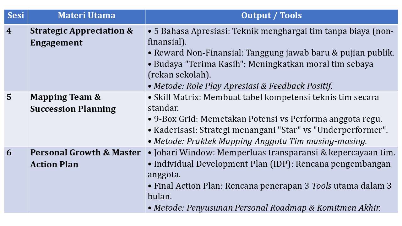 - Build High-Engagement Culture: Menerapkan strategi apresiasi non-finansial dan Growth Mindset untuk meningkatkan loyalitas serta semangat berkontribusi di dalam tim.