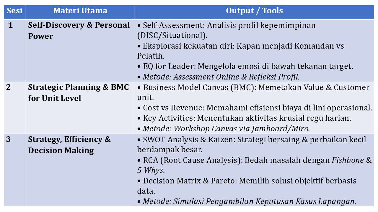 - Elevate Leadership Mindset: Bergeser dari mentalitas "pelaksana tugas" menjadi "pemilik strategi" (ownership) yang mampu menyelaraskan kegiatan unit dengan tujuan besar perusahaan.