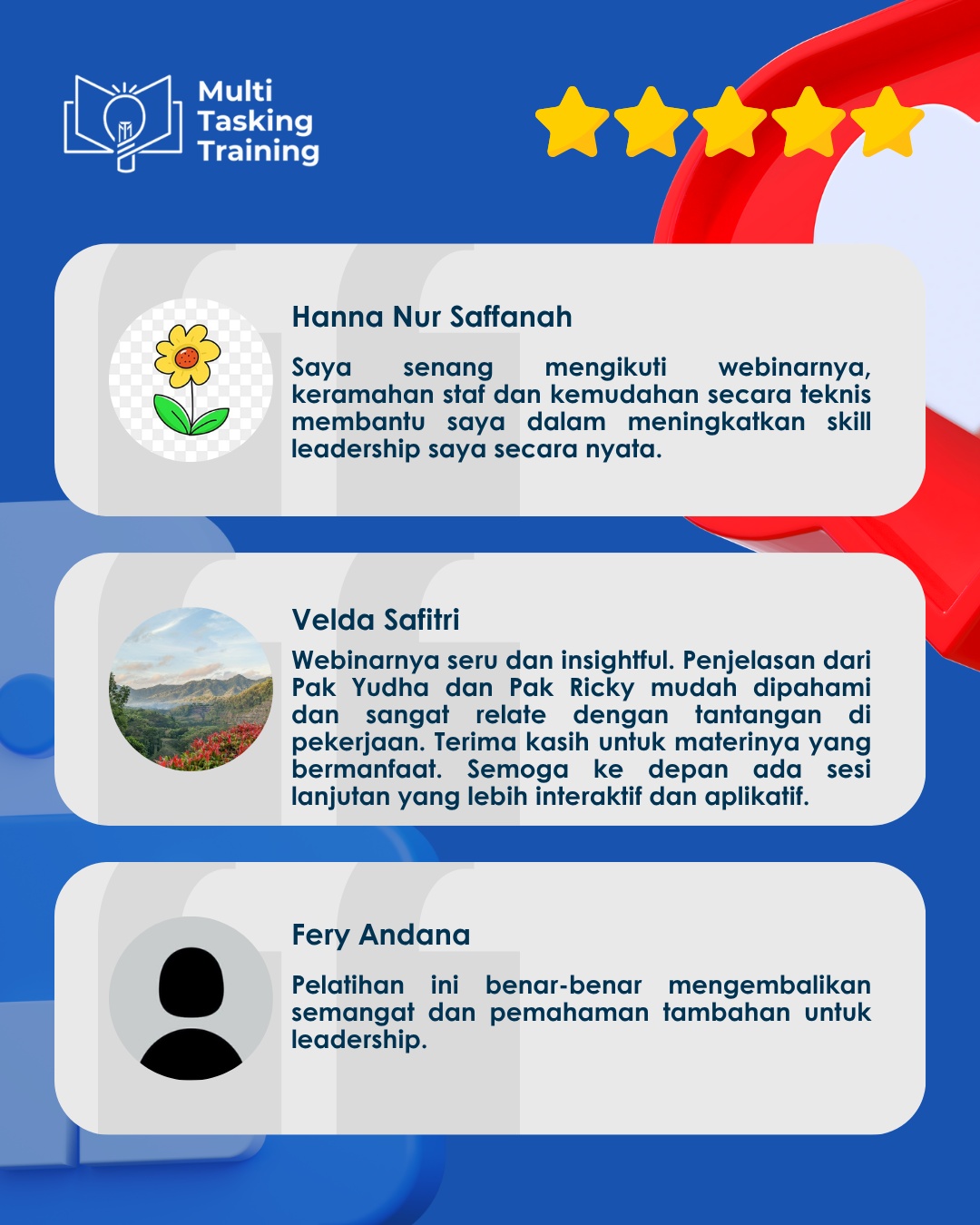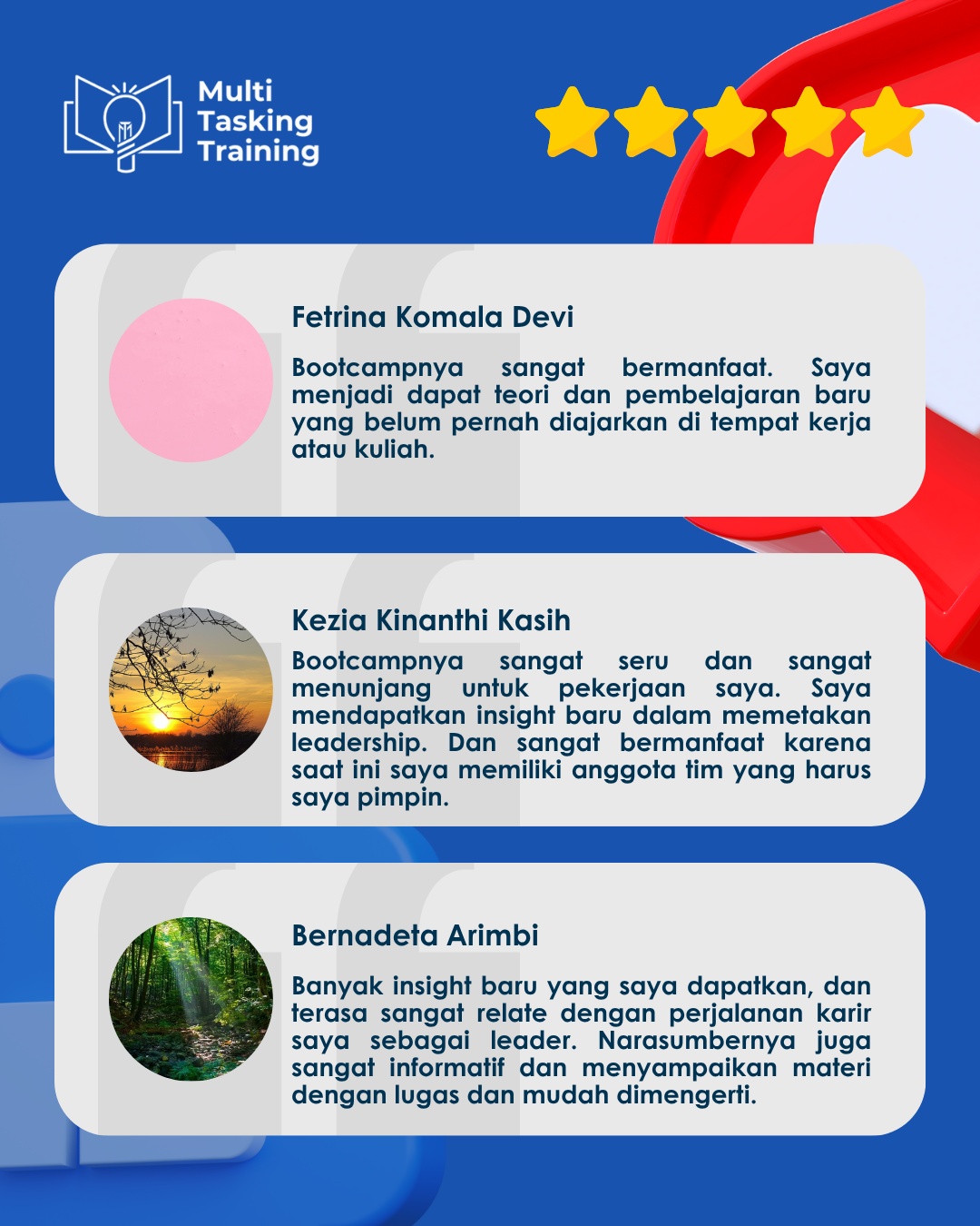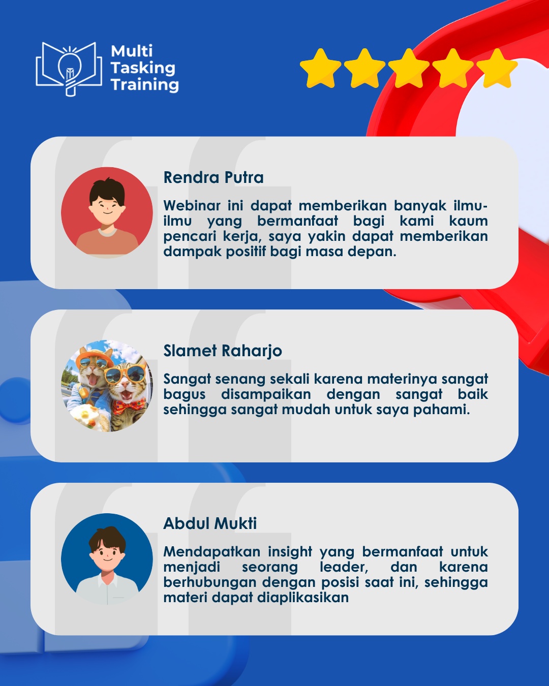 - Meningkatkan Kepercayaan Diri: membangun kepercayaan diri dalam mengambil keputusan dan memimpin tim menuju pencapaian visi misi perusahaan & tujuan bersama.