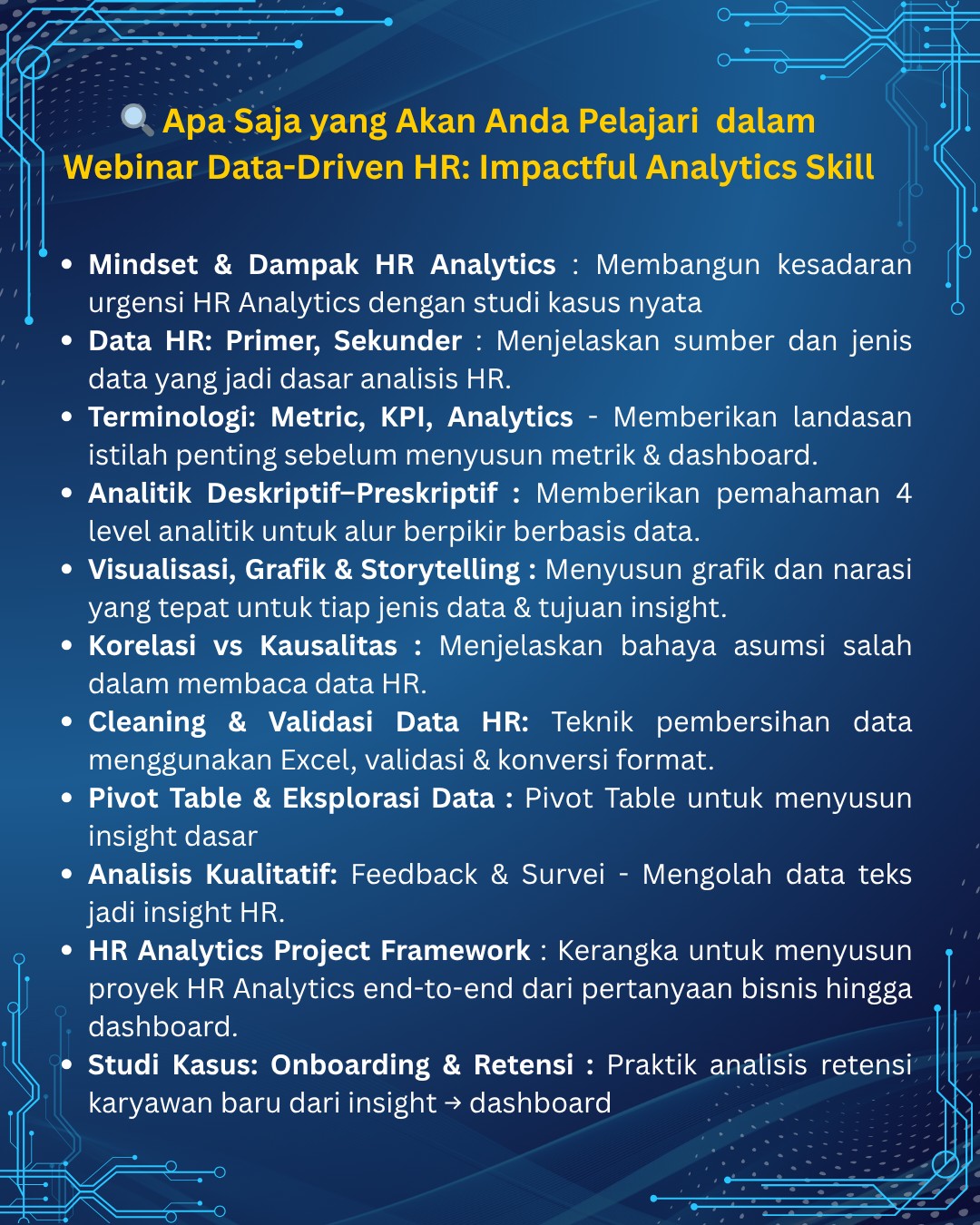 - Mindset & pentingnya HR Data Analytics - Membangun kesadaran urgensi HR Analytics dengan studi kasus nyata