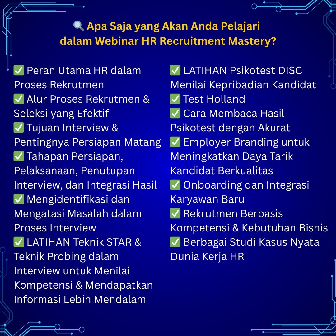 π Saatnya Tingkatkan Skill & Pengetahuan Rekrutmen Anda dengan ikut webinar ini agar mendapatkan panduan step by step serta TIPS & TRIK JITU mulai dari recruitment sampai onboarding karyawan dan Talent Management dengan lengkap & komprehensif bersama 2 orang Profesional Trainer berpengalaman lebih dari 15 tahun di bidang HRGA sektor Pertambangan, Manufaktur & Telekomunikasi untuk perusahaan Asing & Nasional !