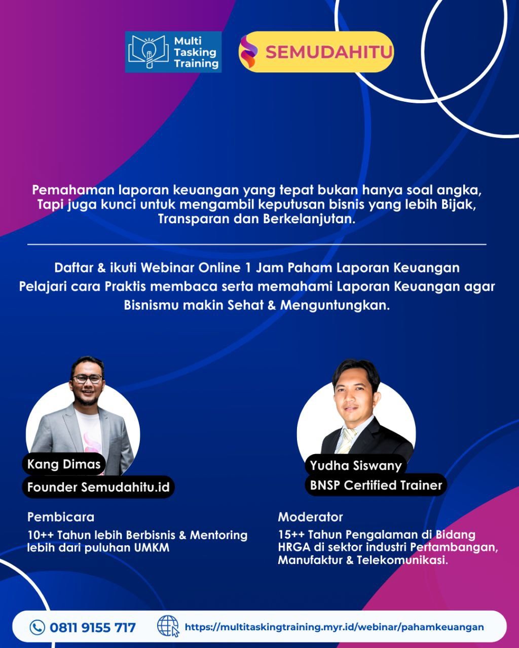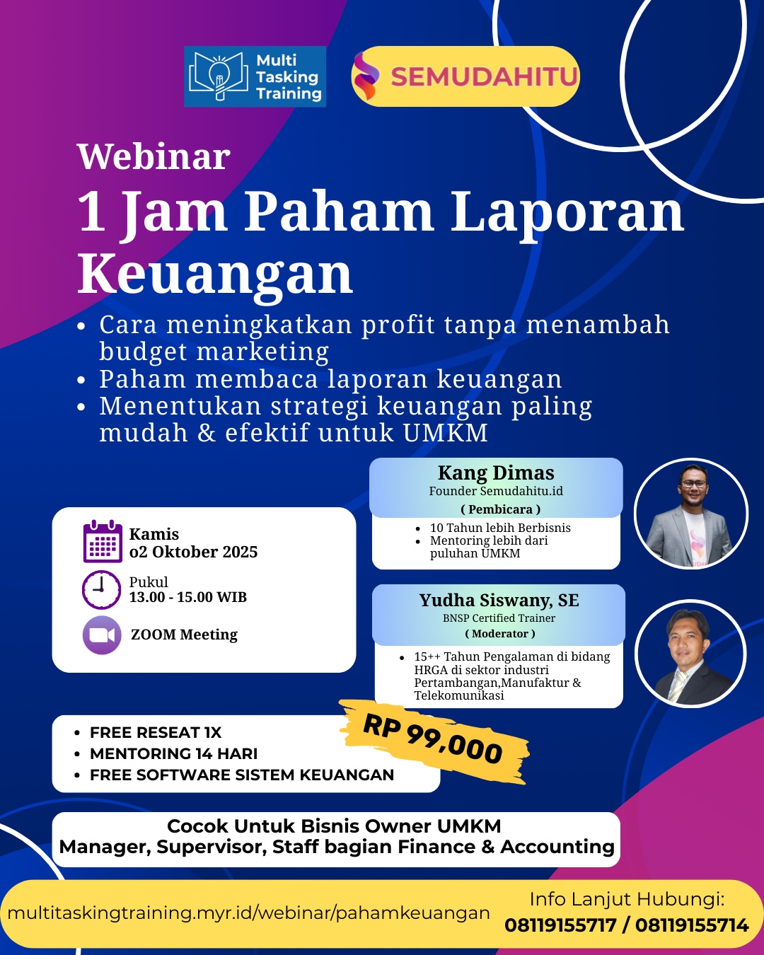 ⏳ 1 jam Paham Laporan Keuangan, Multitasking Training memberikan Solusi kepada bapak/ibu pemilik bisnis UMKM yg punya banyak masalah dalam laporan keuangan bisnisnya sehingga ingin meningkatkan skill & pengetahuan seputar laporan keuangan….