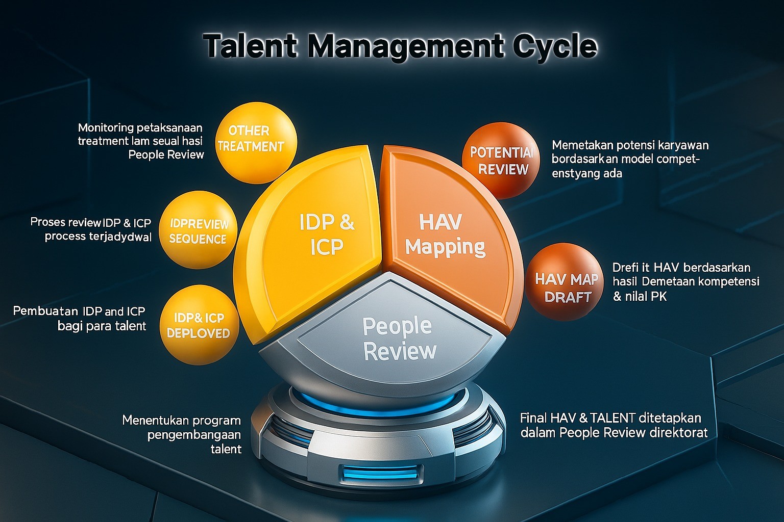 Mengidentifikasi posisi kritis dan menyiapkan suksesor dengan level kesiapan: Ready Now, Ready Soon, Ready Later. Succession plan bukan sekadar chart, tapi roadmap pengembangan nyata.